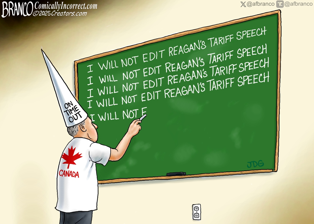 A.F. Branco Cartoon – Trump puts Canada on a time-out (increasing tariffs) over posting a fraudulently edited anti-tariff Reagan video..