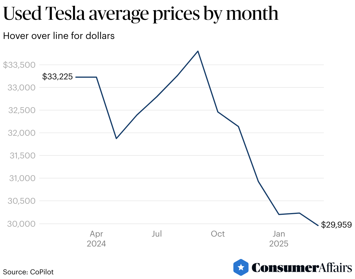 The average price for a used Tesla fell to$29,959 in March, compared with $33,225 a year ago, according to CoPilot.