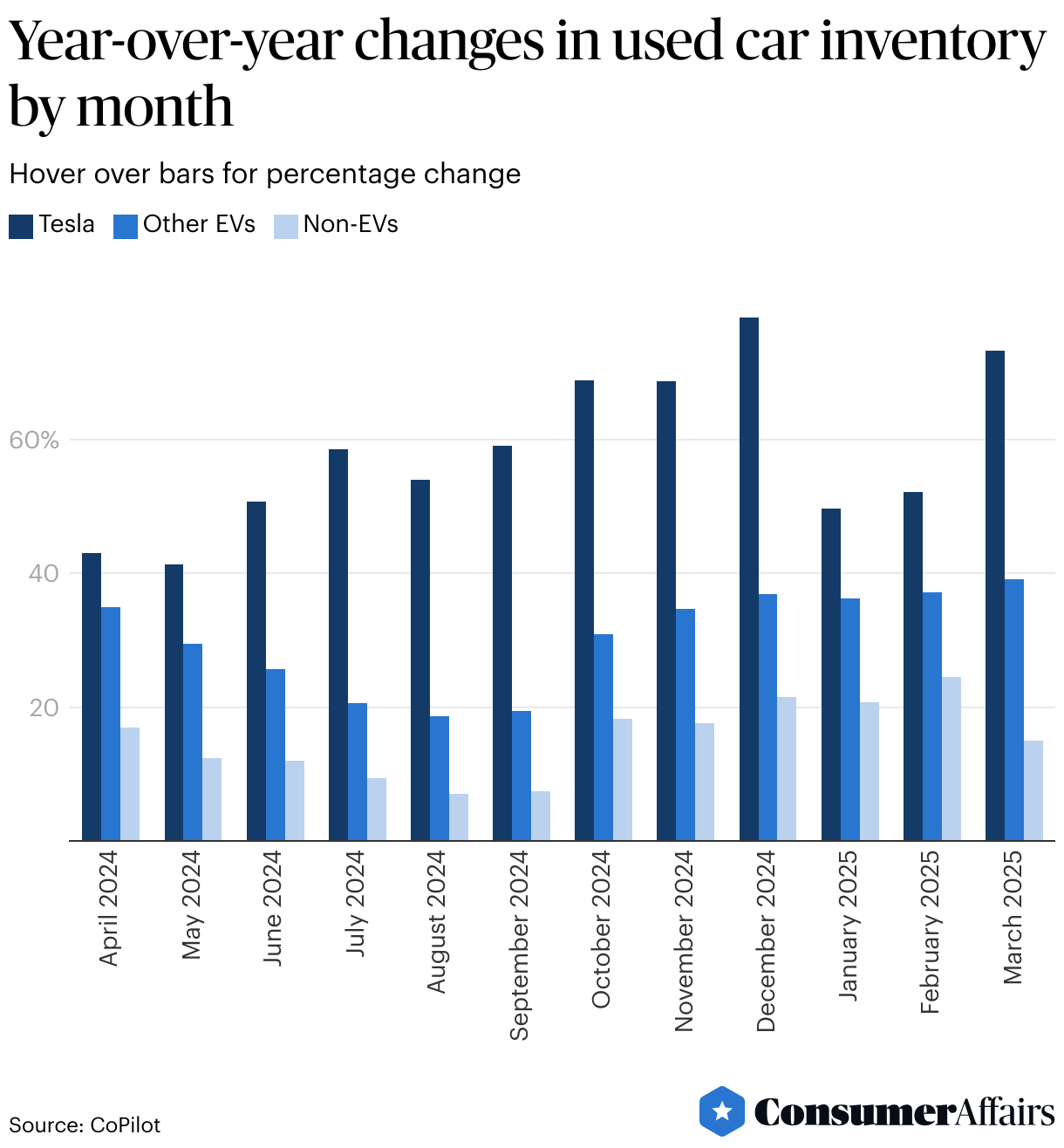 Since January, the number of used Teslas on lots hasballooned nearly 196% as of March, effectively tripling, according to data provided to ConsumerAffairs bycar-shopping app CoPilot.