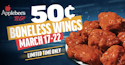 In association with March Madness, Applebee's are offering boneless wings at 50c each for a limited time. Sauces include Classic or Hot Buffalo, Honey BBQ, Sweet Asian Chile, Hot Honey Glaze, and Garlic Parmesan. Shop Now at Applebee's